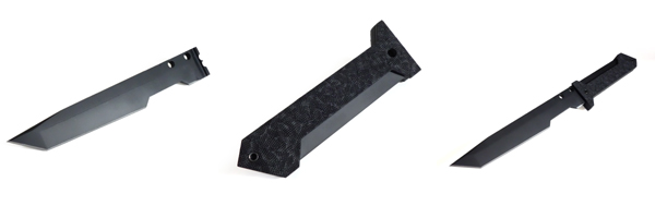 ストレート・タントー型のブレードに、角ばった形のグリップをセットにして、組み合わせた際にあたかも一体型のナイフのように見えるデザインにしました。ブレードは刃部分以外をマットブラック塗装仕上げ。グリップも表面には実際にステッピング加工を施して滑り止め仕上げにしてあります(´ω`)ゞ
