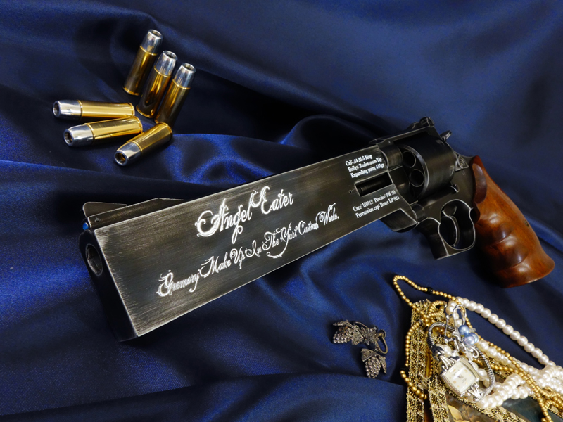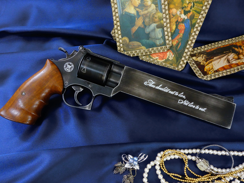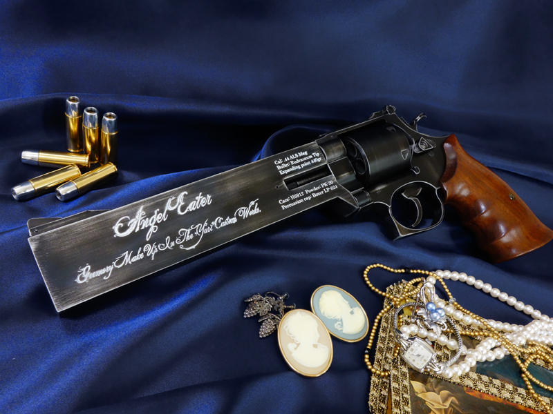 マルシンのXカートリッジ式ガスルボルバー「S&W M629 クラッシック」をベースに、契約により古の魔神が姿を変えたミステリアスな銃器という設定で製作したオリジナルカスタムです。