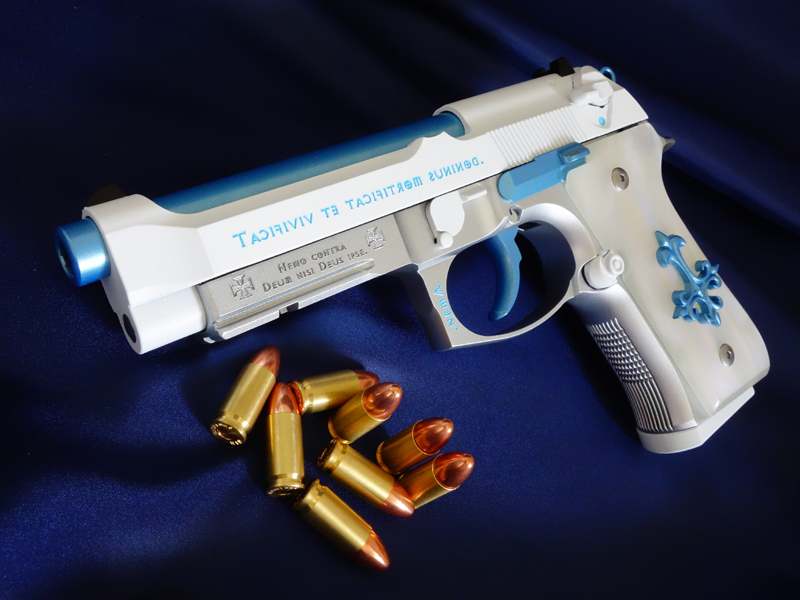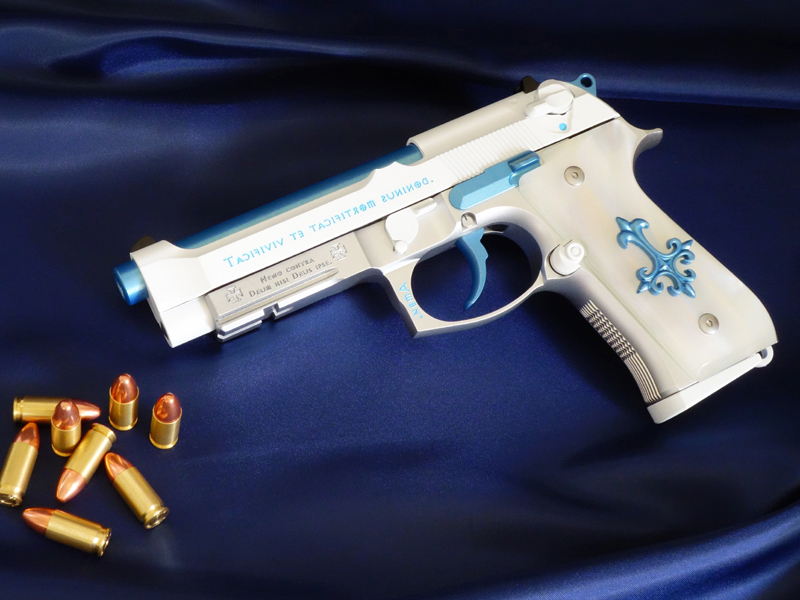 マルイのガスブローバックガン「M9A1」をベースに、「見た目は神聖で実は邪悪な力を持った銃」という設定で製作したオリジナルカスタムです。