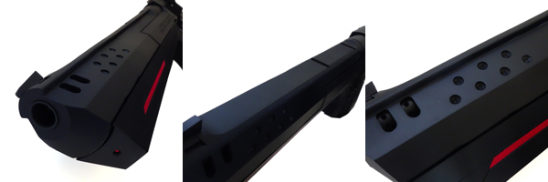 側面には発射時の燃焼ガスを効率よく逃がして反動を抑えるガスポートと、銃身内に溜まった熱を発散させる排熱孔を備える。