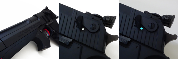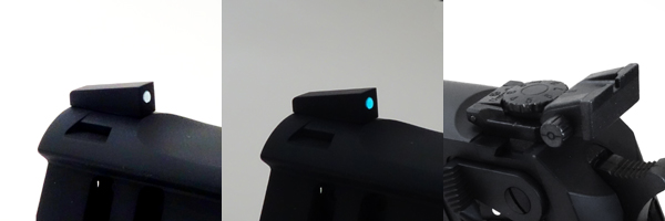 フロントサイトは幅・長さともに大型化された夜光ドットタイプ。リアサイトは上下左右に調整可能なアジャスタブル・リアサイトに交換されている。