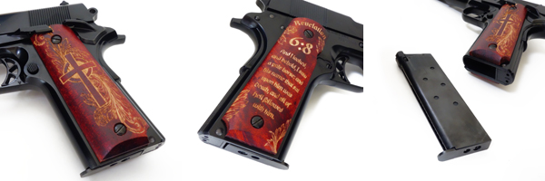 内容はスタンダードなガバメントカスタムですが、戦う聖職者というイメージに合わせてグリップを選んだり、ご依頼主様お気に入りという「ジッポーライター」を参考に、色と質感を決めていきました。