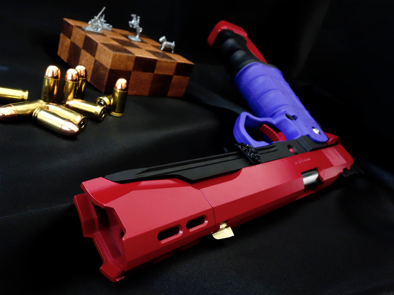 実銃モチーフはおそらくSTI(Science Technolgy Ingenuity)社製のガバメントモデル。世界スピード射撃選手権者のチップ・マコーミックと共同開発したコンバットシューティング・ガンで、スティール製レシーバーとポリマー製グリップを一体化させ、軽量化と高強度性を合わせ持つ多弾倉フレームを搭載した「現代的戦闘銃」です。