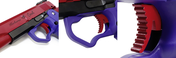 赤いビーバーテイル型グリップセイフティ。 〇「刹那」カスタムの加工済みパーツを赤く塗装仕上げしました。左側面にスイッチがあり、これを上下にスライドさせることでセミ/フルの動作を変更できます。