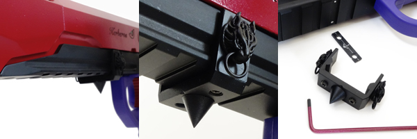 ○市販品のレール付きシャーシに交換。プラ素材(狼ヘッド部分=市販アイテムは金属製)でオリジナル製作したレール飾りを装着しました。底部は首輪のスパイクをイメージ。2本のイモネジとスペーサーでレールに固定しています。