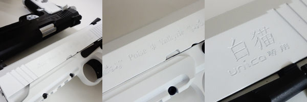 専用パーツとして製作され、白く塗装されたスライド。短めのスライド長でリコイルスピードも速く、速射しやすい。スライド左面に舞装乙女を表す"Poise ⚜ Valkyrie"と、"白猫"、"unica専用"の刻印が彫り込まれている。