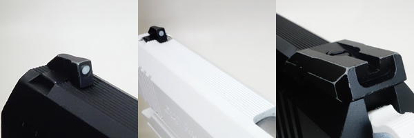 二丁とも白ドット入りのフロントサイトとドット無しのコンバットタイプリアサイト。瞬時に狙いを定めて素早く撃つのに適したセットアップになっている。