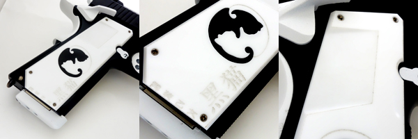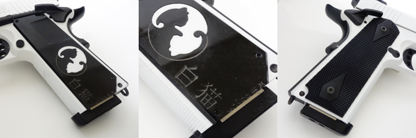 白猫の白いフレームに映える黒のグリップパネル。白猫は右手で握るよう設計されているため、左のグリップパネルのみ極薄型の専用グリップパネルを装着している。パネルの中央には黑猫白猫の紋章と"白猫" "unica専用"の刻印が彫り込まれている。