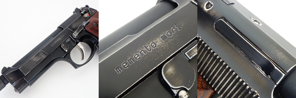 ○ベースのM92FCSの刻印を埋めて、上述の刻印を彫り直しました。前部セレーションも実際に機械加工で彫り込み。仕上げはマットブラック塗装後に研磨加工で使い込まれたヴィンテージ風に仕上げにしました。刻印の「memento mori」はラテン語の格言で、直訳すると"死を記憶せよ"、意訳するならば"いつか来るだろう死を忘れるな"というかんじの意味合いです(´ω`)