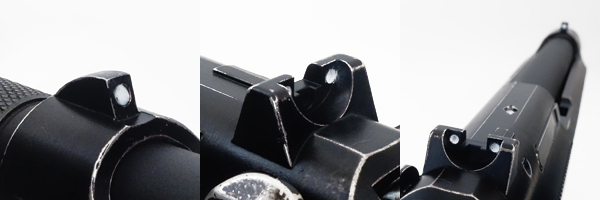 フロント・リア共に白ドットの入れられた3ドットサイトシステム。これによりサプレッサーで銃口付近が多少隠れても、感覚的に狙いが付けられるように工夫されている。