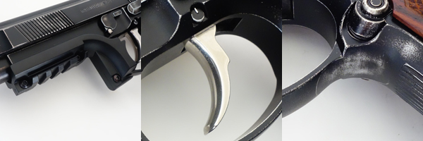 トリガーはステンレス製のカスタムトリガーに交換され、表面を徹底的にポリッシュすることでトリガーフィーリングと精度を高めている。この暗殺者のこだわりが垣間見えるパーツといえる。トリガーガード付け根はより深く握り込むために削り込み加工されている。