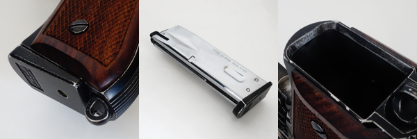 マガジンは一般的なM92F用マガジンを使用している。使用弾薬は9mmパラベラム弾で、装弾数は15発。グリップ底部のマガジン挿入口は素早く確実にマガジンを装填できるように大きく面取り加工が施されている。