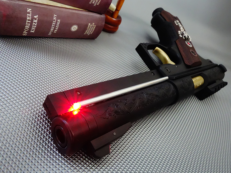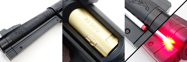 角張ったアンダーリブ付きのバレル。右側面には現用の軍事用レーザー以上の性能をもつレーザーサイトを装備しており、距離に合わせて自動で輝度や着弾点の誤差までも調整する。