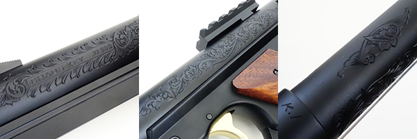 バレルとアッパーフレーム全面にわたって美しいヨーロピアンリーフの彫刻が施されている。この装飾によってこの銃が単なる道具としての銃ではなく、骸骨閣下の専用装備であり特別な意味を持つアイテムであるという一種の「表示」になっている。