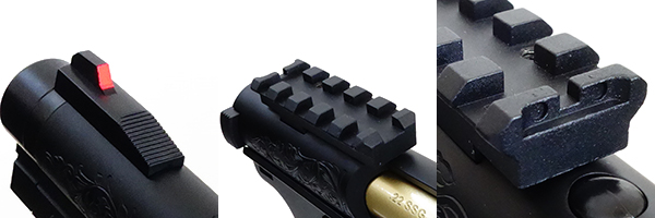 大型のフロントサイトとリアサイト兼20mmレイル。リアのレイルにはダットサイトなど各種の光学機器を装着可能。