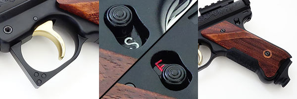 トリガーは金色。トリガーガードは大型化されており、爪の付いたガントレットなどを装備していてもトリガーに指を掛けやすくなっている。セイフティレバーもON/OFFが確実にわかるように色分けされており、大胆に見えて慎重・確実な閣下の一面が垣間見える。