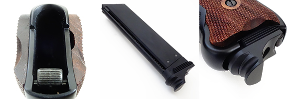 シングルカラムで.22口径弾薬が10発装填可能なマガジン。本体マガジン挿入口は差し込みやすいように拡張されており、弾倉底部には専用マグバンパーも装着されている。
