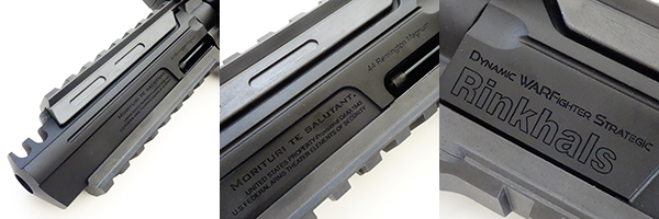 ガスホール(発射ガスを効率よく噴出させて射撃時の反動を抑える)付きのバレル。各部に標語や使用弾薬表示、運用組織名などの刻印が彫られている。