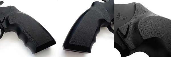 専用のフィンガーチャネル付きオリジナルグリップ。しっかりと握り込み、なおかつ可能であれば机などへ押し当てて依託射撃が可能なようにグリップ底部が平らなデザインになっている。