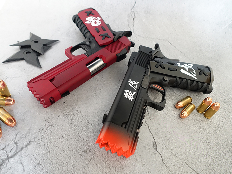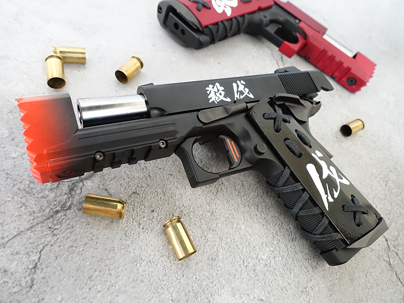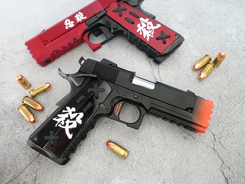 このデトニクスのスライドとガバメント系のフレームを組み合わせ、さらに近接戦闘に特化したカスタムモデルを、性能・品質共に信頼性抜群の東京マルイがモデルアップ。マズル面をスパイク状に加工した「ストライクプレート・コンペンセイター」やレールマウント、マグウェルなど、随所に現代的なCQBカスタムアレンジを加えており、コンパクトスライドのショートリコイルと相まってトイガンとしても非常に実用性の高い内容のモデルだと思います^^