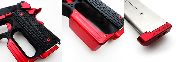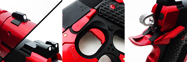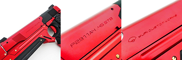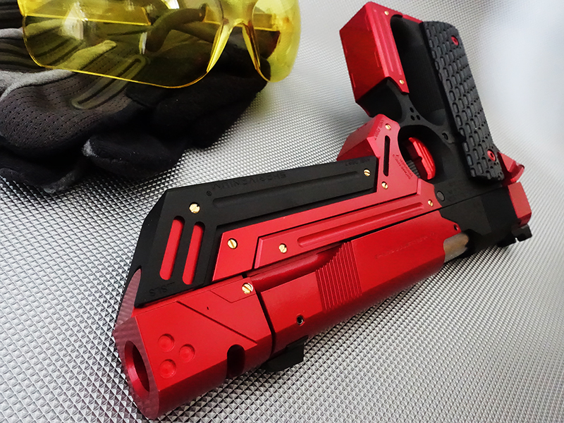 スタンダードサイズの1911系をベースにしたカスタムスライド。他の装甲部分と同じく超硬スチール合金製、メタリックレッドとマットブラックでナノラミネート・フィニッシュされている。