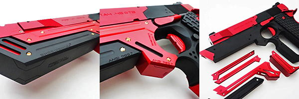 ○プラ素材でオリジナル製作。まずベース銃のフレームを大幅に増設して、その上にプロテクターを装着する構造にしてあります。実際にイモネジを取り外して脱着可能。黒地にメタリックレッドのプロテクター、金色のネジでメカっぽさを表現しました。