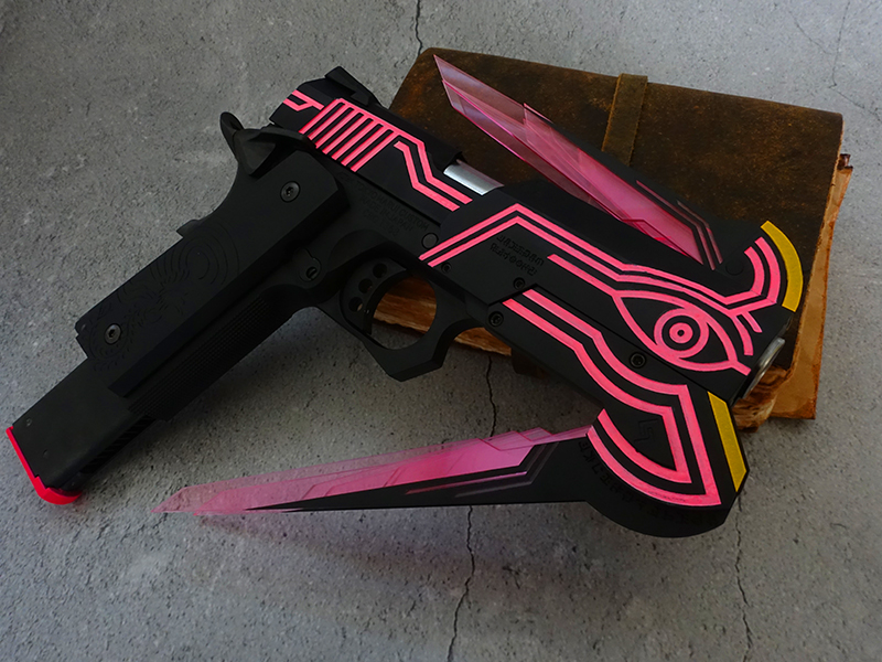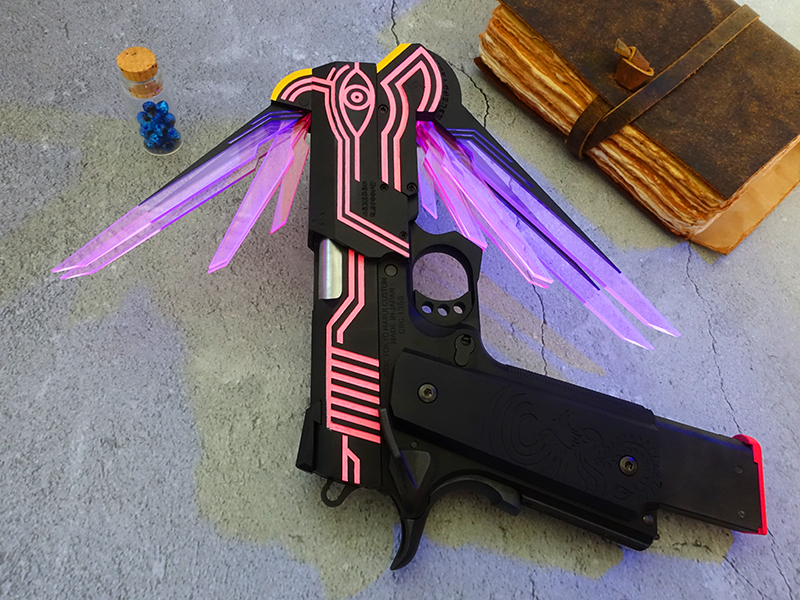 女神が取り憑いたガラクタガスガンは女神の象徴である「鳥の翼と遠くを見通す眼」を表す模様を表面に纏い、その上下には妖しく光る魔法の翼を大きく広げる。