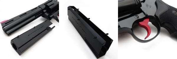 全長:292mm 銃身長:143mm 重量:665g 使用弾薬:6mmBB弾(0.2g) 装弾数:24発 ベース品型名:東京マルイ コルトパイソン.357マグナム 6インチ/新型 主素材:ABS樹脂