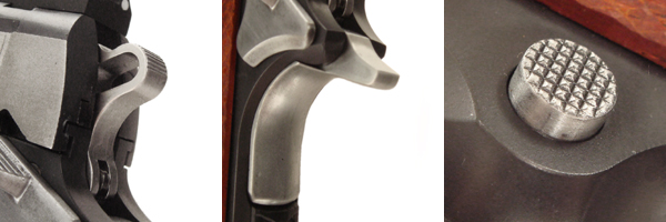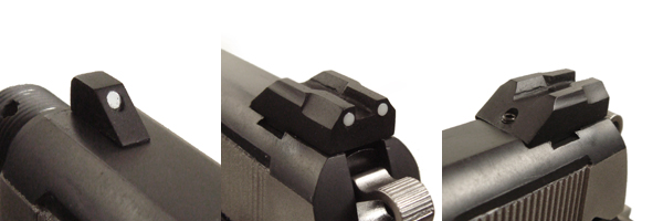 フロントサイトは大型で、視認性が非常に高い。リアサイトは固定式だが、現在でいう「コンバットタイプ」で瞬間的に標的を捉えやすい実戦的な形状。当時としてはかなり先進的なスタイルだった。
