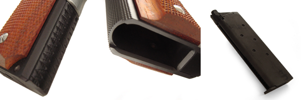 ○MEUピストルのフレームをベースに一部を切削して、あくまで『M1911A1フレームを加工した』風に再現してみました。ノーマルガバにチェッカリングを入れるより、MEUフレームに手を加えたほうが効率的なので(;´Д`)