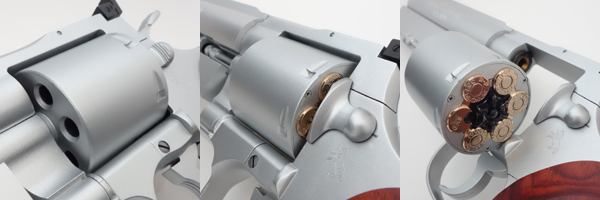 左側面には「SILVER SERPENT※」「☆ .44 MAGNUM ☆」の刻印が刻まれている。(※コルト社のリボルバーには代々「蛇」の名前を冠する慣例がある。パイソン、キングコブラ、アナコンダ等。)