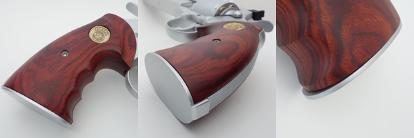ローズウッド削り出しのカスタムグリップで、重たい銃をしっかり保持するために前面にはフィンガーチャネルも設けられている。