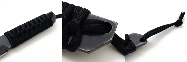 パラシュートコード(高強度ナイロンで編まれた紐)を日本刀の柄巻きのように編んである。長い一本のコードを立体的に編みこんでおり、雨や泥などに浸かっても滑りにくい。