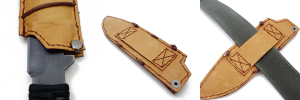 表には周囲に巻きつく様な構造で細い革紐を通してあり、紐の張り具合で鞘のブレード保持のキツさ調整ができる。また差込口にはホックが取り付けられており、収納時にはこれを閉じておくことで激しい動きをしても抜け落ちることがない。