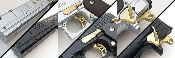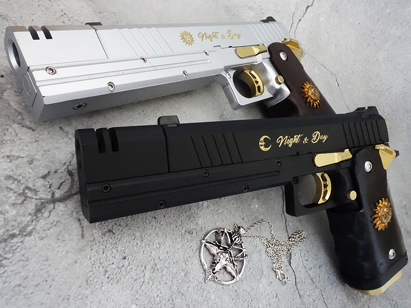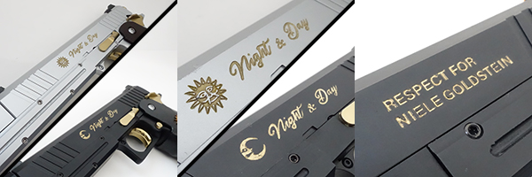 武骨に角ばった強化スライド。側面には銃の銘が刻まれており、ナイトには月、デイには太陽をモチーフとした図案が刻印されている。右側には作者がリスペクトを込めた人物への言葉も刻まれている。