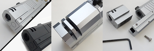 スライドをそのまま延長したかのような武骨なコンペセイター。発射の燃焼ガスを効率よく排出して反動を抑える効果がある。