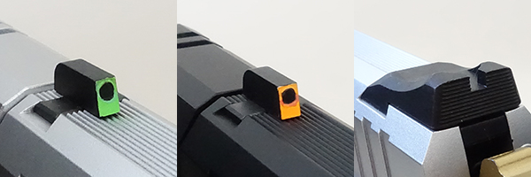 フロントサイトの射手面はそれぞれグリーンとオレンジにペイントされ、黒いドットが埋め込まれている。蛍光カラーのため非常に視認性に優れる。リアサイトは共通のコンバットタイプサイト。
