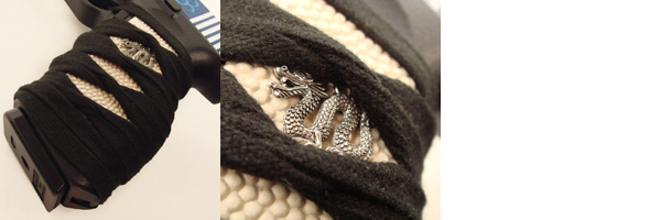 黒色の平紐をしっかりと組んだ柄糸拵え。地には白の鮫革風素材を使用しており、両側面には「龍」の飾り金具が配されている。オーソドックスながらしっかりと和を表現している特徴的なグリップ。