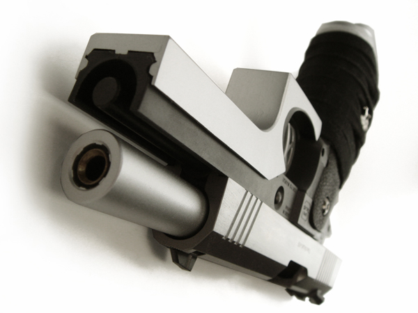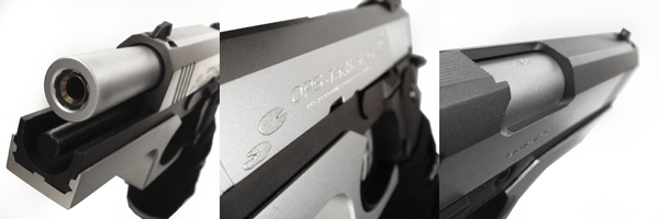 艶を抑えたステンレス製コーンバレル。.45口径の強装弾も確実に発射できる性能を持つ。 ○下塗り後にキャロムシルバーで塗装。スライドとの摩擦があるのでキャロムジルコニアでコーティングしています。