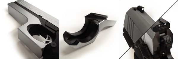 強度の高い特殊鋼を鍛えて製造されたフレーム補強パーツ。ボルト類を一切使わず、強装弾の衝撃から本体を守る。飾りの一切ない造形だが、そのシャープなラインは切れ味鋭い刃物を連想させる。 ○プラで完全オリジナル製作。シャーシのレールに差し込んで装着します。トリガーガード前部は三日月形にえぐれたデザインで、レスト状態のときはトリガーにかける指を乗せておけます。この部分はマットブラック塗装、それ以外は(トリガーも)キャロムシルバー塗装。