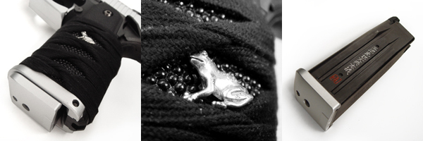 黒い綿の平紐をしっかりと組んだ柄糸拵え。地には黒染めのエイ革を使用しており、両側面に「三池」にちなんだ蛙の飾り金具が配されている。 ○フェイクレザーと平紐を使って日本刀の柄拵えにしています。レザーは専用塗料で黒く「染めて」います。飾り金具は金属製です。