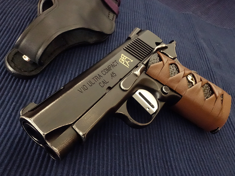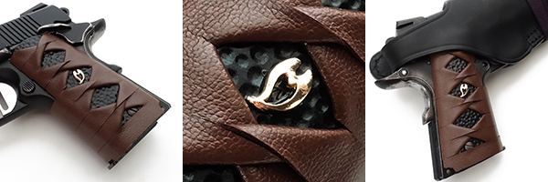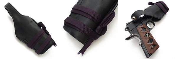 革製のホルスター。牛革製のため銃にフィットし、しかもカイデックスなどの樹脂製ホルスターと違って銃本体を傷つけない。外側には紫色の下げ緒を巻いてあり、和服のたすき掛け、負傷して銃を握りにくくなった際の手と銃の固定、さらには緊急時の傷の止血など、ただの飾りではなくあくまで実戦での使用を想定している。
