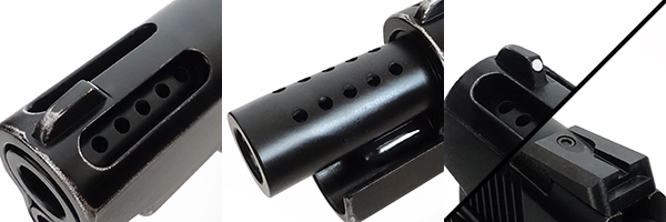 3.5インチ弱のコーンバレル。上面に10個のガスホールが開けられている。これは短い銃身で.45口径弾薬を撃つと強烈な発射反動が起こるため、発射ガスを効率よく逃がして反動を最小限に抑える為の形状。