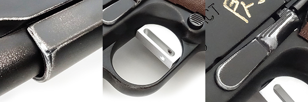 スライドストップレバーやサムセイフティ、グリップセイフティなどのグリップ周辺の操作系パーツも角を丸く削られている。瞬間的な操作での引っ掛かりをなくすと共にグリップハンドへの当たりもソフトになっている。