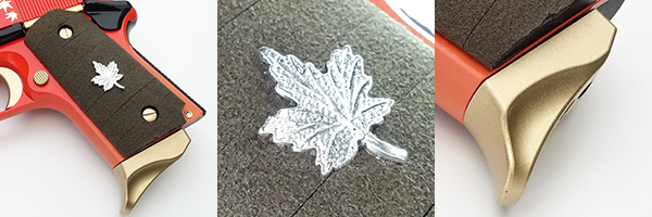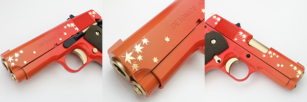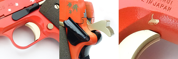 トリガー・ハンマー・マガジンキャッチボタンは金コーティングされ、スライドストップ・サムセイフティ・グリッププレートは黒の漆塗りで仕上げられている。